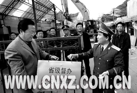 11月8日下午,省級督辦、市級掛牌的我市重大火災隱患單位宣武市場,由于其東市場的整體拆除而摘下了警示牌。這是我市歷史上第一次對重大火災隱患部位實施整體拆除。明年,一個現代化的新市場將在原址建成。